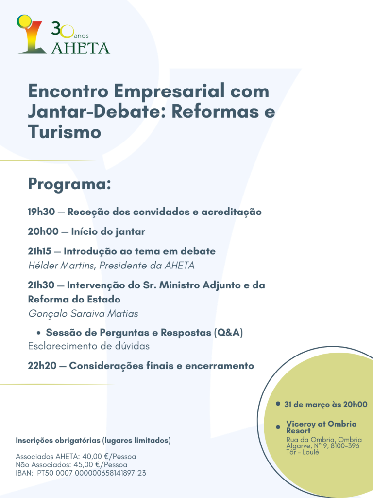 O Jantar-Debate terá lugar no Vila Vita Parc e é aberto a todos os interessados, sejam ou não associados da AHETA. O número de lugares é limitado, pelo que a participação está sujeita a inscrição prévia. O custo de participação é de 40 euros para associados e 45 euros para não associados.